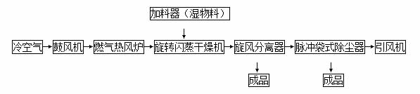經換熱器加熱后的潔凈空氣被鼓入進風口,以適宜的速度旋入干燥室底部的環隙,然后按切線方向進入干燥室,并呈螺旋狀上升:同時,物料則由可無級調速的加料器定量加入塔內。在干燥塔內,物料與熱空氣進行充分、高效的質熱變換,被干燥的粉狀物料隨同熱風一起輸送至分離器,其中成品收集包裝,而尾氣則進一步經除塵裝置處理后排空。